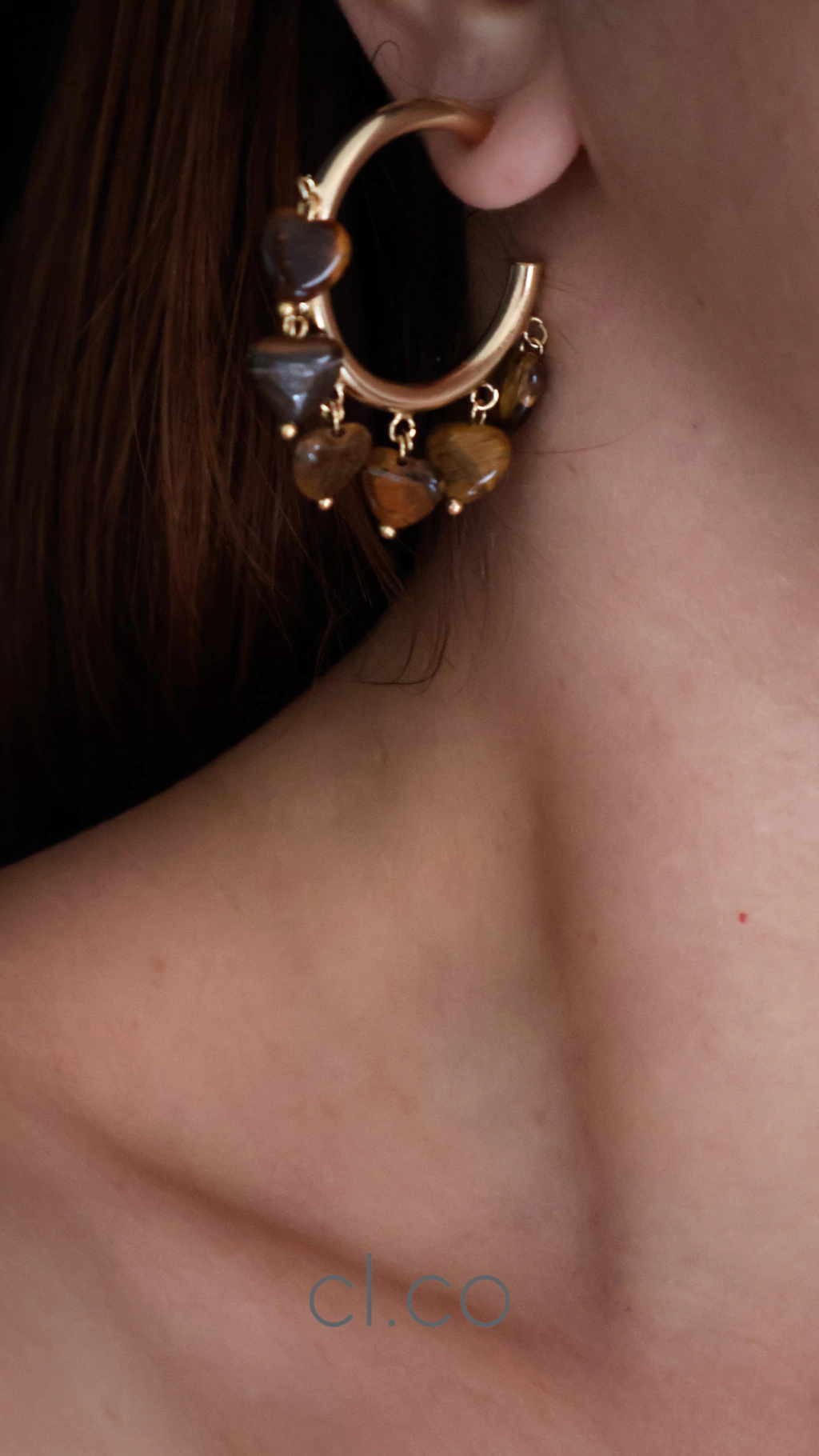Releitura do nosso design-ícone da Argola Mykonos, agora com pedra natural de Olho de Tigre, marcada por tons terrosos e veios orgânicos que refletem a luz com sofisticação.