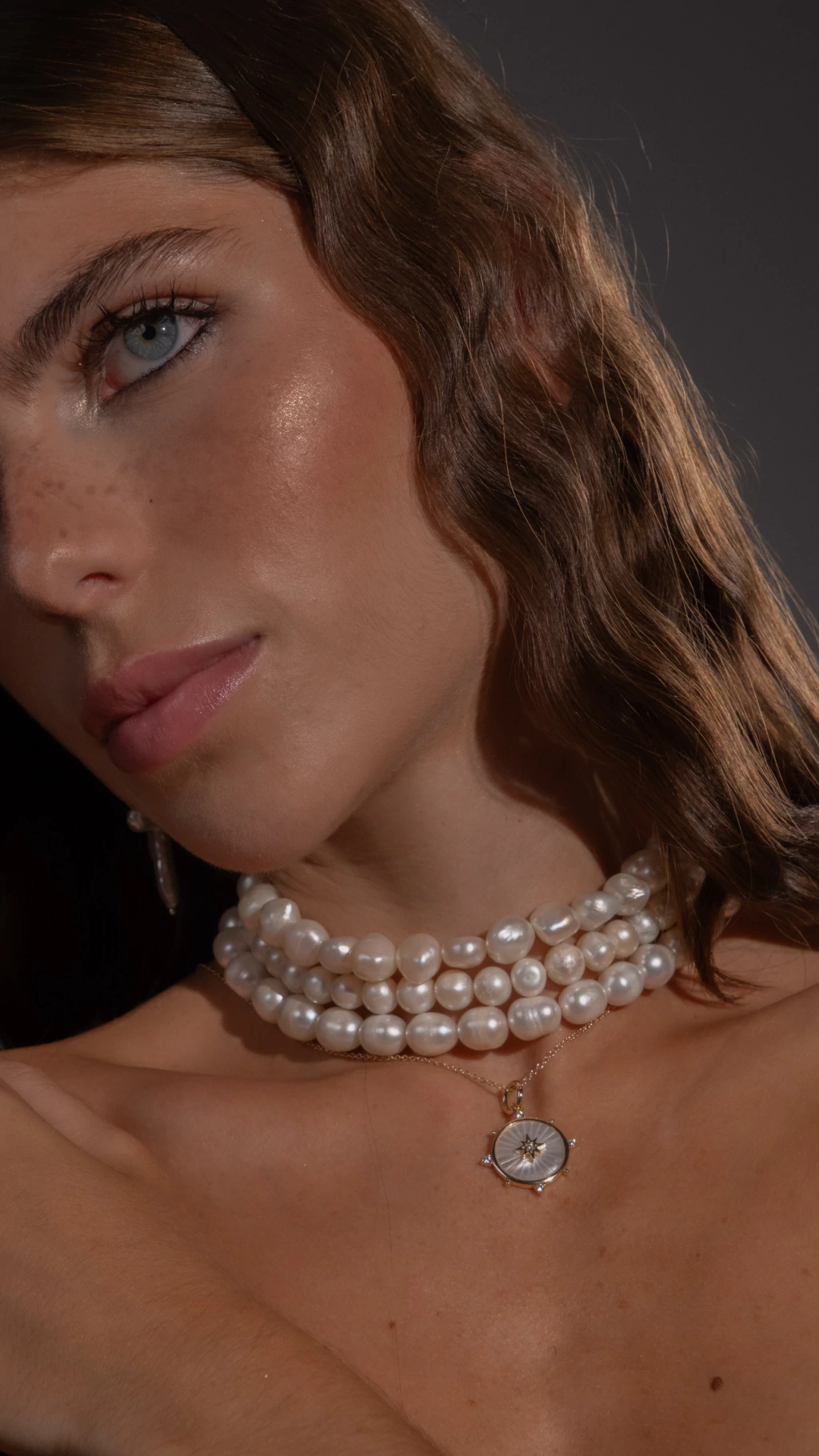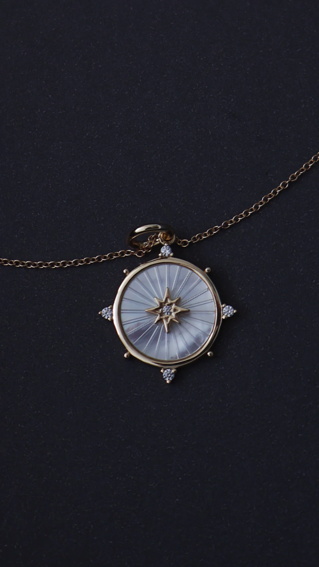 Madrepérola esculpida com estrela central. Um halo luminoso e versátil.