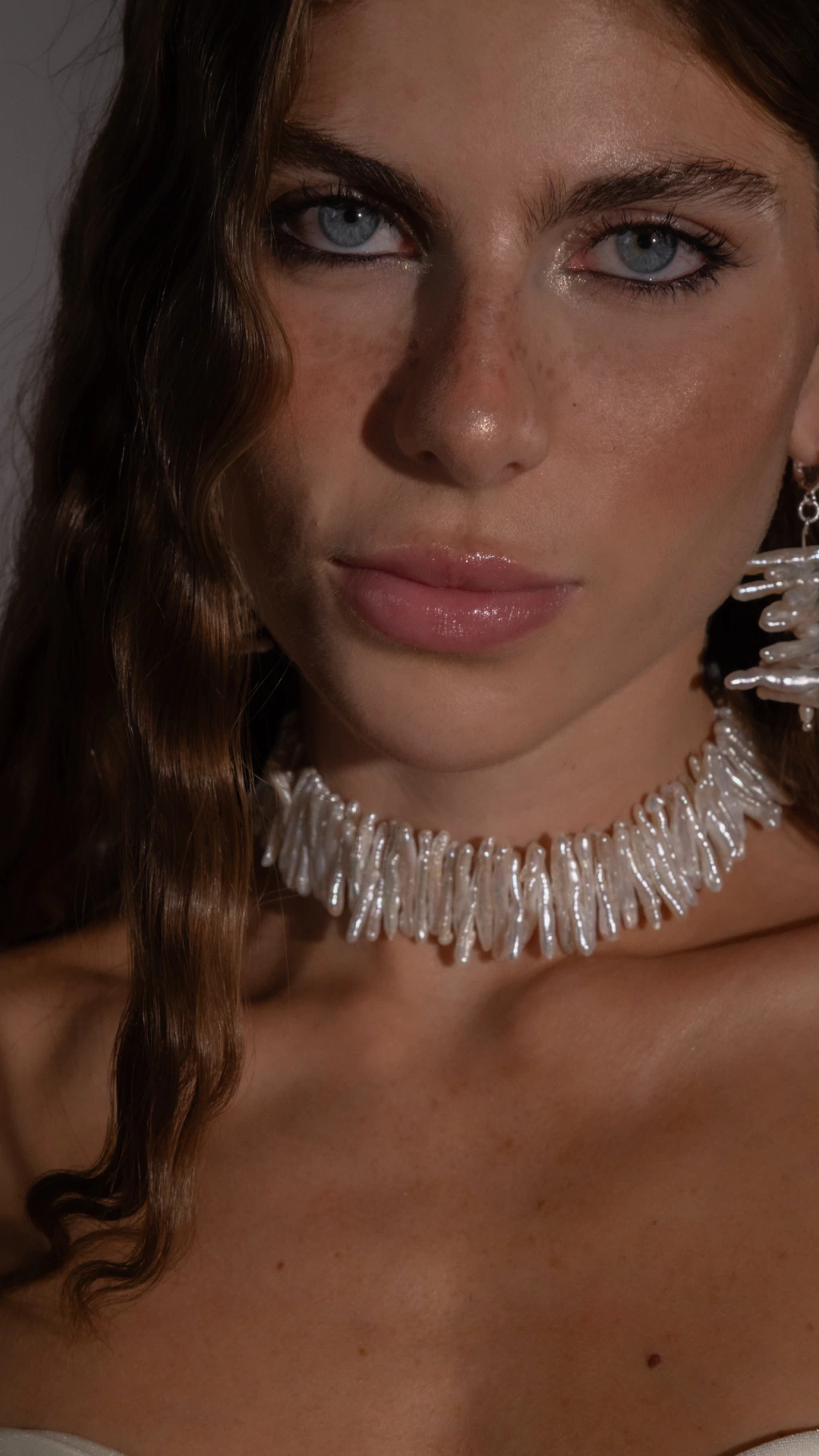 Pérolas palito sobrepostas em camadas orgânicas. Um statement fresh, cool e naturalmente elegante.