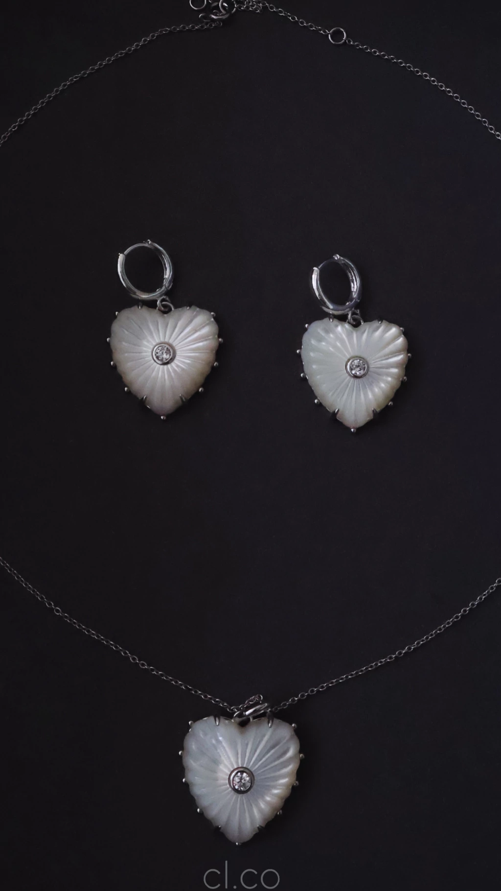 Coração entalhado em madrepérola com brilho central. Atemporal, leve e ultra-feminino.