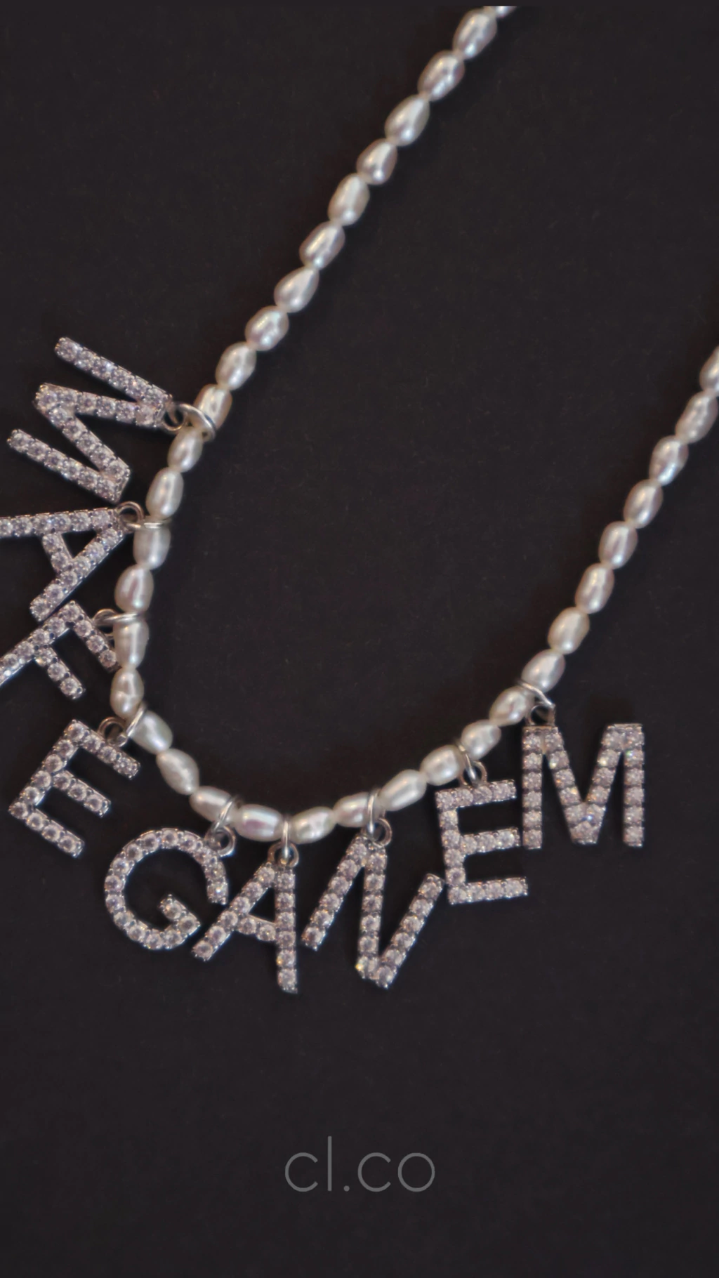 Pérolas irregulares com letras cravejadas. Afetivo, cool e com presença sutil.