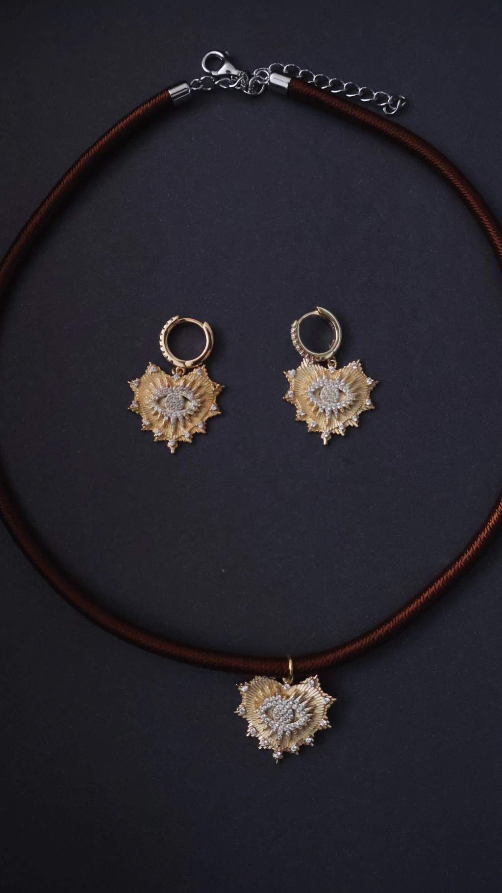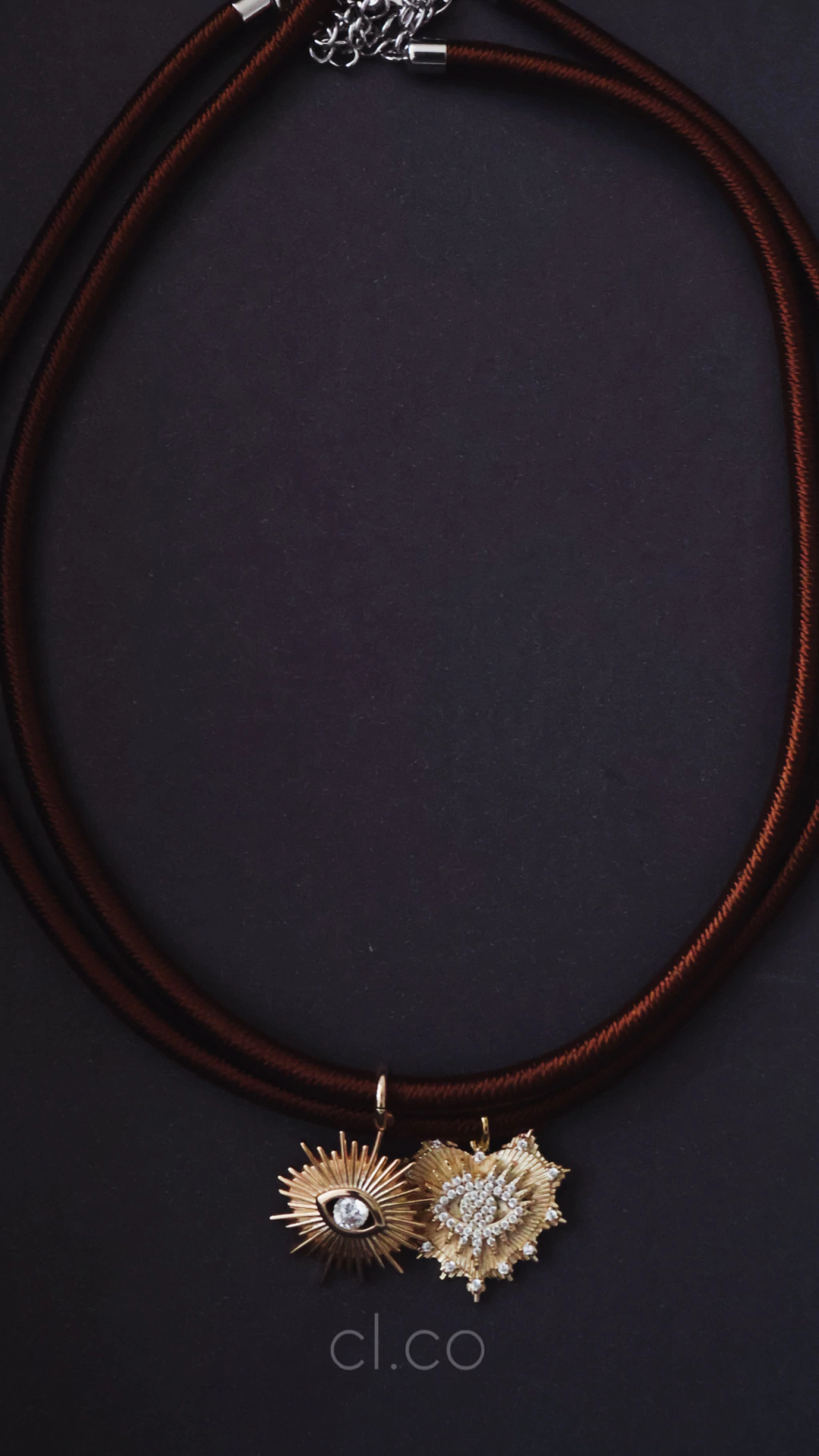 Colar em fio de seda marrom, soft e sofisticado, com opção de dois pingentes: coração ou olho em ouro 18k com zirconia. Um design clean, versátil e afetivo, perfeito para usar sozinho ou em camadas, criando um mood clássico, cool e cheio de personalidade.
